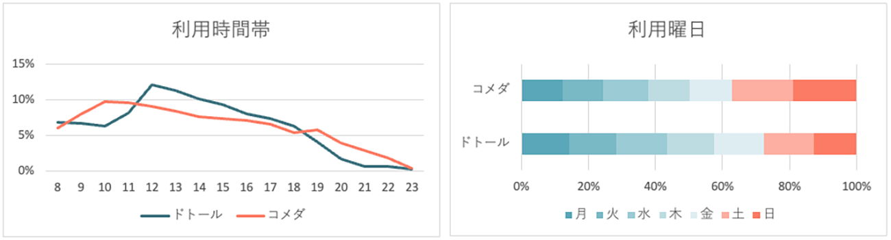 ロイヤル層は、カフェチェーン全体と比較してどちらも男性の比率が高めであった。ただドトールのほうがやや年齢層が高く、利用シーンも平日の日中がメインであることから、都市部のビジネスマンの利用が多いことがデータからも伺えた。一方、コメダ珈琲のロイヤル層は午前中に利用している傾向があり、コメダのモーニングがお気に入りなのだと予想できる。