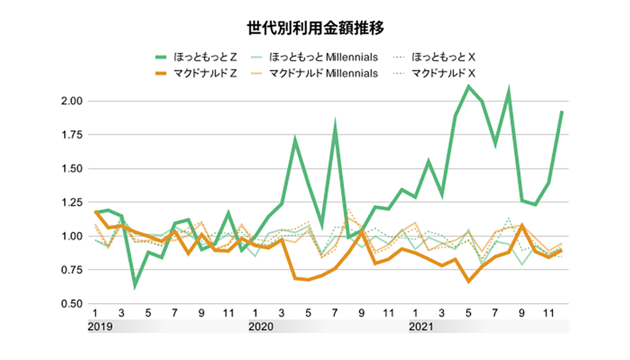 最後に、ファストフードジャンルの中からマクドナルドとほっともっとの利用者を、時系列で世代別に比較する。どちらのブランドも、デリバリーやテイクアウトが利用できることから、コロナ禍においてもコロナ前と変わらない水準で推移していた。