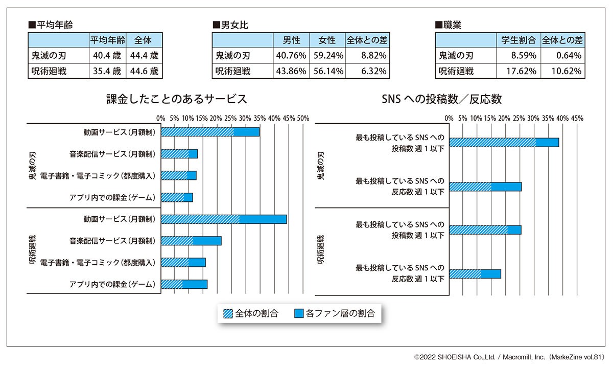 また、課金したことのあるサービスでは、動画サービスは高いものの、音楽・電子書籍・ゲームは全体と近しい傾向となっている。一方で、女性の割合やSNSの投稿・反応数は全体と比べて高く、アニメ放送後のファン層と同様の傾向が見られる。アニメ放送後のファン層と同じような特徴は残しつつも、普段アニメを見ないような層にも流入したことから『鬼滅の刃』の映画は大ヒットし、ファン層はより一般層に近い分布となっていると考えられる。