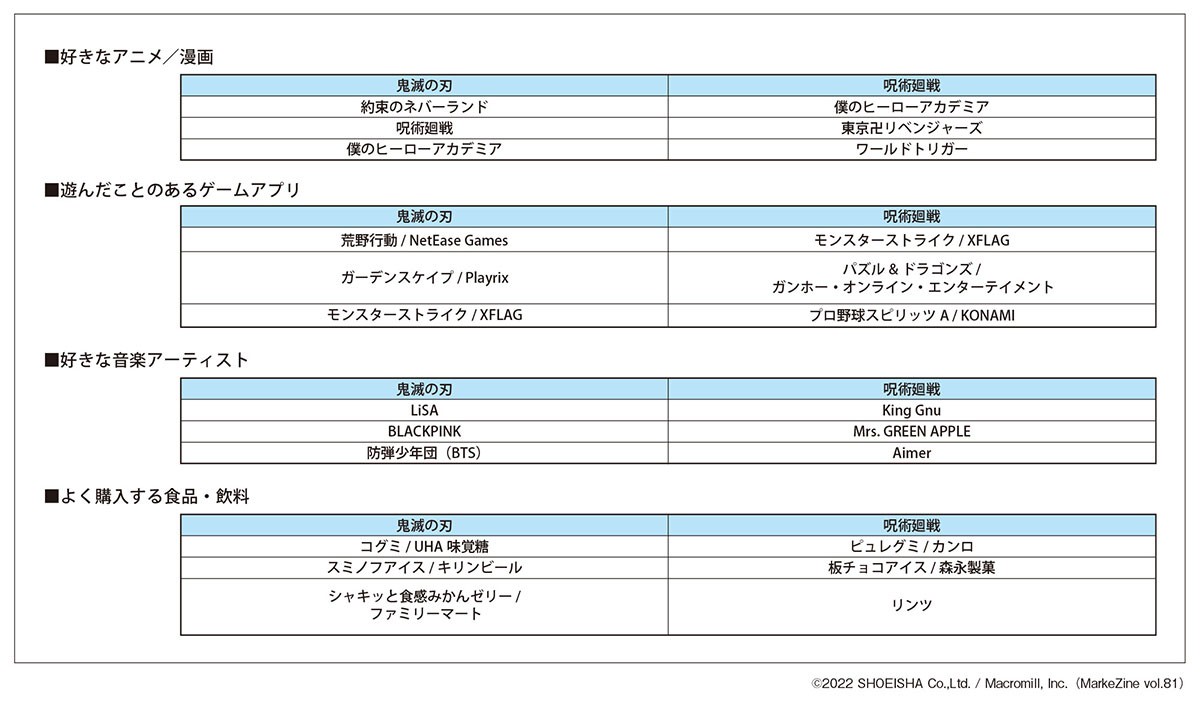 「モンスターストライク」はどちらの作品ともコラボしており、アニメのキャラクターをゲーム内で使用できることが、ファン層に好まれた一因と考えられる。好きな音楽アーティストは、アニメ放送時と同様に関連のあるアーティストが好まれ、『鬼滅の刃』は依然としてLiSAが、『呪術廻戦』は映画の主題歌を担当したKingGnuが上位となっている。