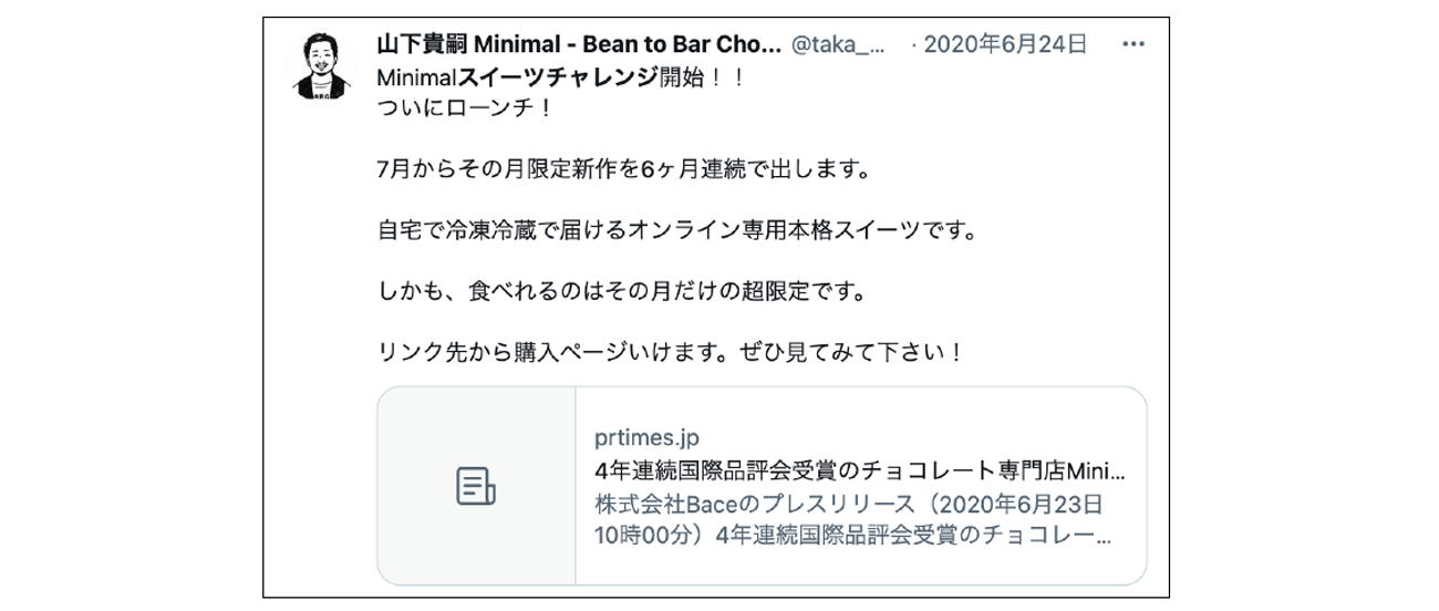 「スイーツチャレンジ」という企画では6ヶ月の期間限定で毎月新作のオンラインスイーツを届けた。同企画は「開発広報販売の100本ノック」ともいえ、これを通してMinimalの開発、広報、販売速度は猛烈に上がり、オンラインスイーツについての認知が高まる効果もあった。