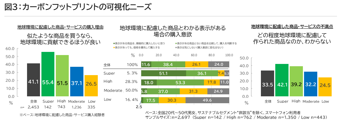 カーボンフットプリントのように、商品ごとのCO2排出量を可視化することに対してのニーズがどれだけあるかを把握するための設問の結果を抜き出した(図表3)