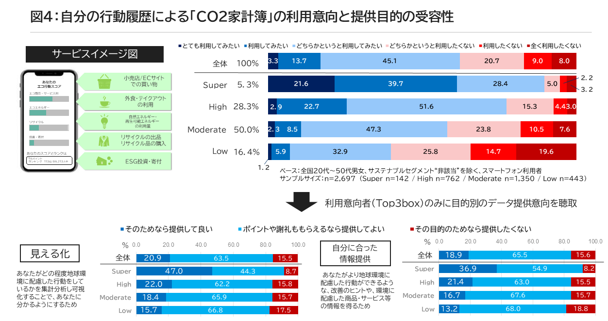図表4 自分の行動履歴による「CO2 家計簿」の利用意向と提供目的の受容性(タップで画像拡大)