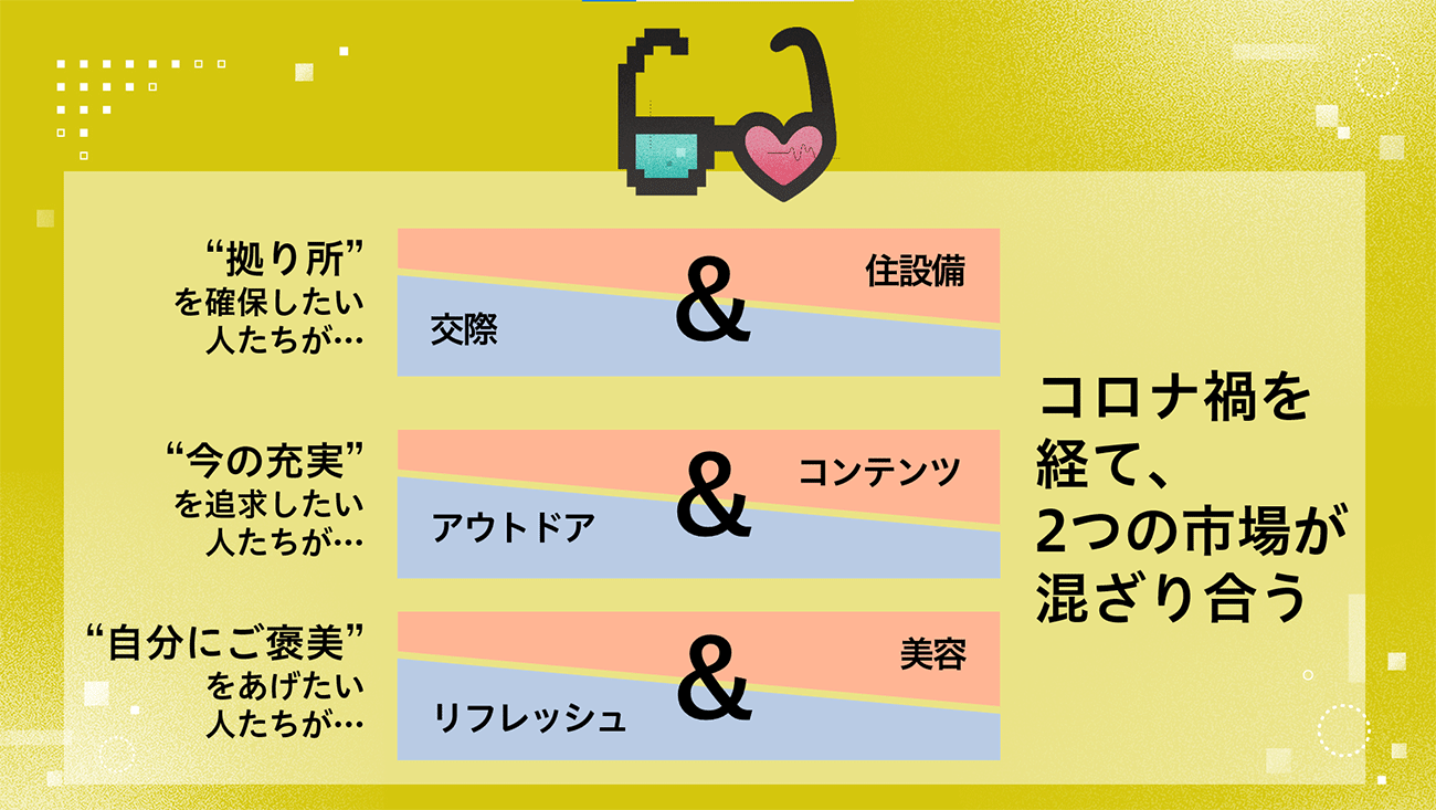 現在、行動制限の緩和でコロナ禍で行った支出のシフトに揺り戻しが起こっている。しかし、完全に以前の状態に戻るというよりは、この分析で見えてきた拠り所の確保、今の充実、自分へのご褒美といったベースの意識の上で、2つの市場は混ざり合っていくことになるだろう。