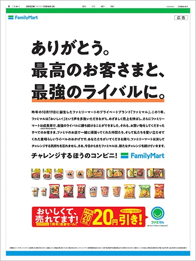 三浦:新聞広告では、お客様への感謝とともに、ライバルへの感謝も表しました。実際、強いライバルの存在も、ファミリーマートの社内の方々と僕ら外部パートナーの皆が一丸となってがんばれた要因なので。欧米では、競合を挑発するような広告はよくありますが、日本では過激なメッセージはあまり好まれません。その中でも、感謝の気持ちとチャレンジャーの姿勢を、謙虚に、上品に、ちょっとやんちゃに伝えられるよう精査して、この表現に着地しました。