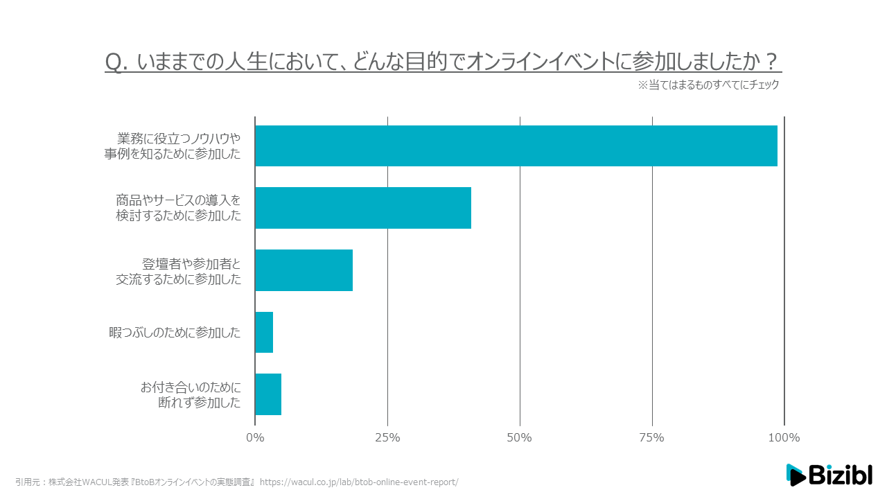 ウェビナー参加者は「ノウハウや事例を知るために参加した」という方が圧倒的多数です。つまり何かしら「情報を得たい、勉強したい」というモードでウェビナーに参加しています。