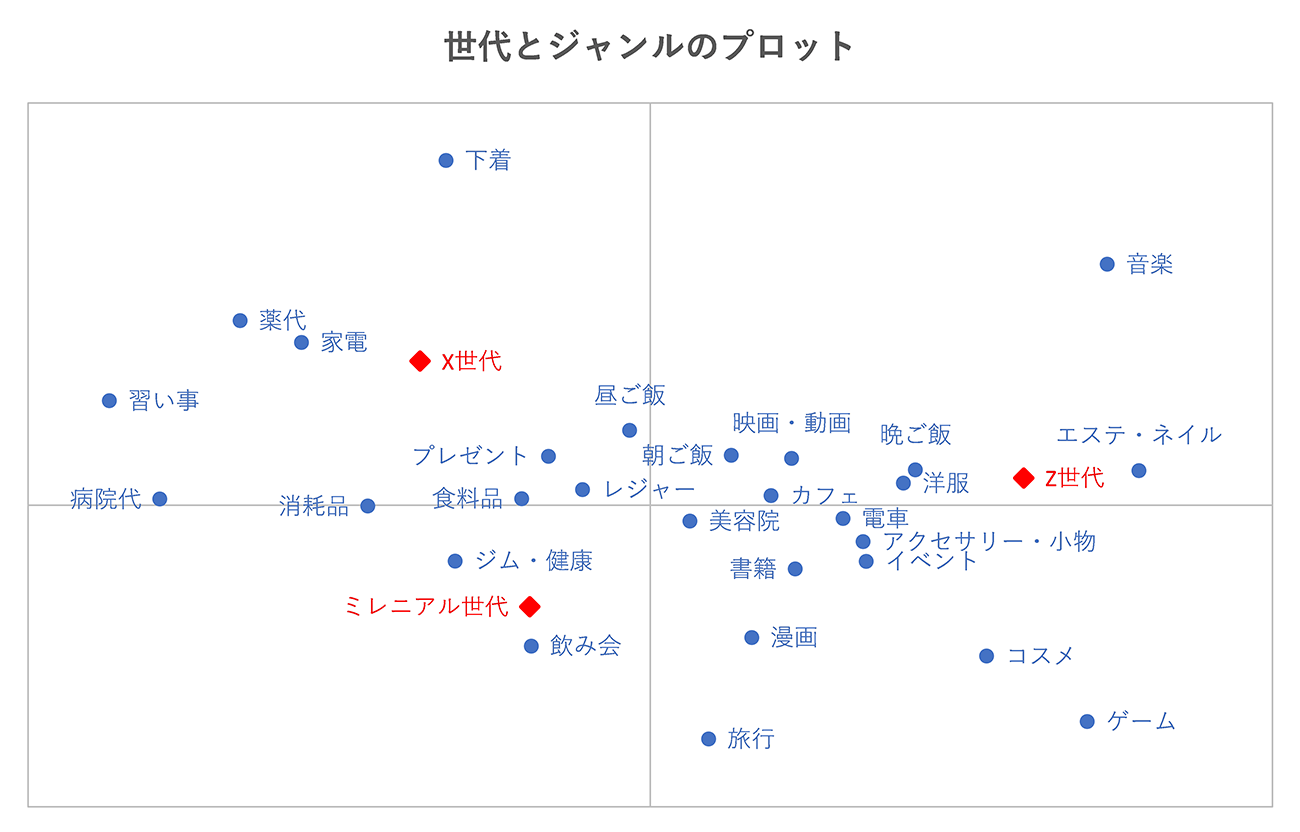 また、以下の図はコレスポンデンス分析により世代とジャンルのプロットを行ったものとなる。タグを付けることの多いジャンルの買い物が各世代のプロットされた位置に近くなるため、その世代にとって特別な意味を持つ買い物であるといえる。