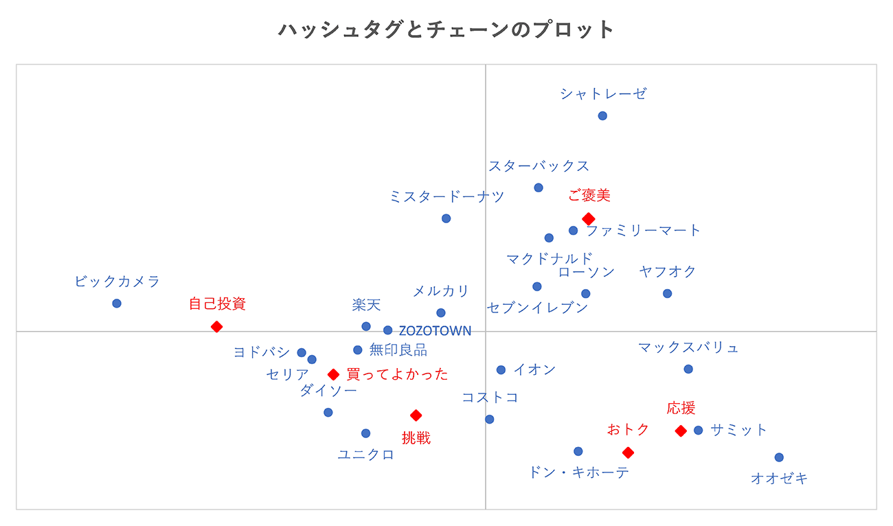 「#おトク」「#応援」は「スーパー」や「ディスカウントストア」系チェーンとの結びつきが強くなっていた。また、「#買ってよかった」は「100円ショップ」と「ファッション」との結びつきが強い。自分の趣味に合うファッションアイテムを買えた時の嬉しさや、低価格でいい商品が買えた時の満足感を表していると思われる。