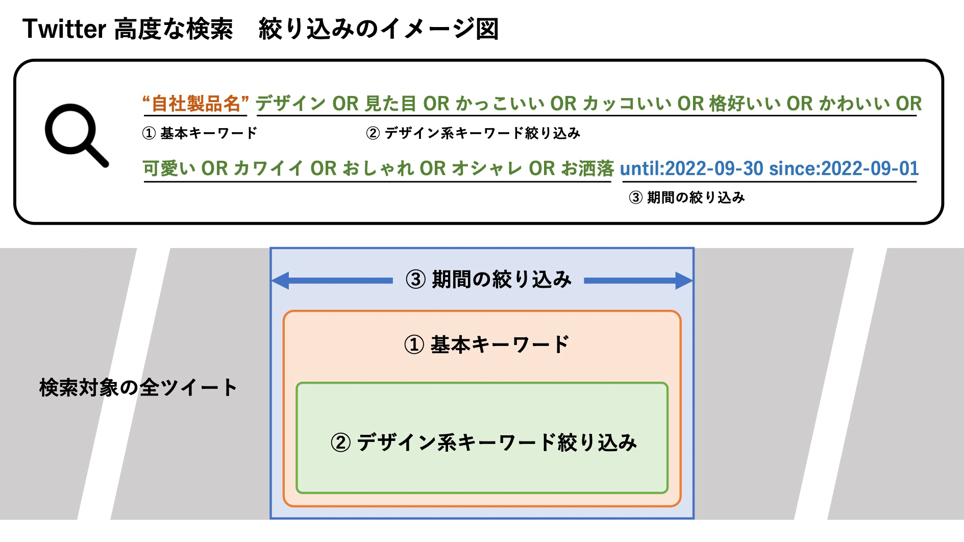 実際に分析する際は、目的によって検索キーワードや絞り込みに工夫が必要です。イメージしやすくするために、実用例を示します。なお下記の通り、分析したい事柄に関連する検索キーワードを選ぶ際、言葉の表現や表記の方法が複数ある場合は、「OR」を使って併記するとまとめて検索できます。