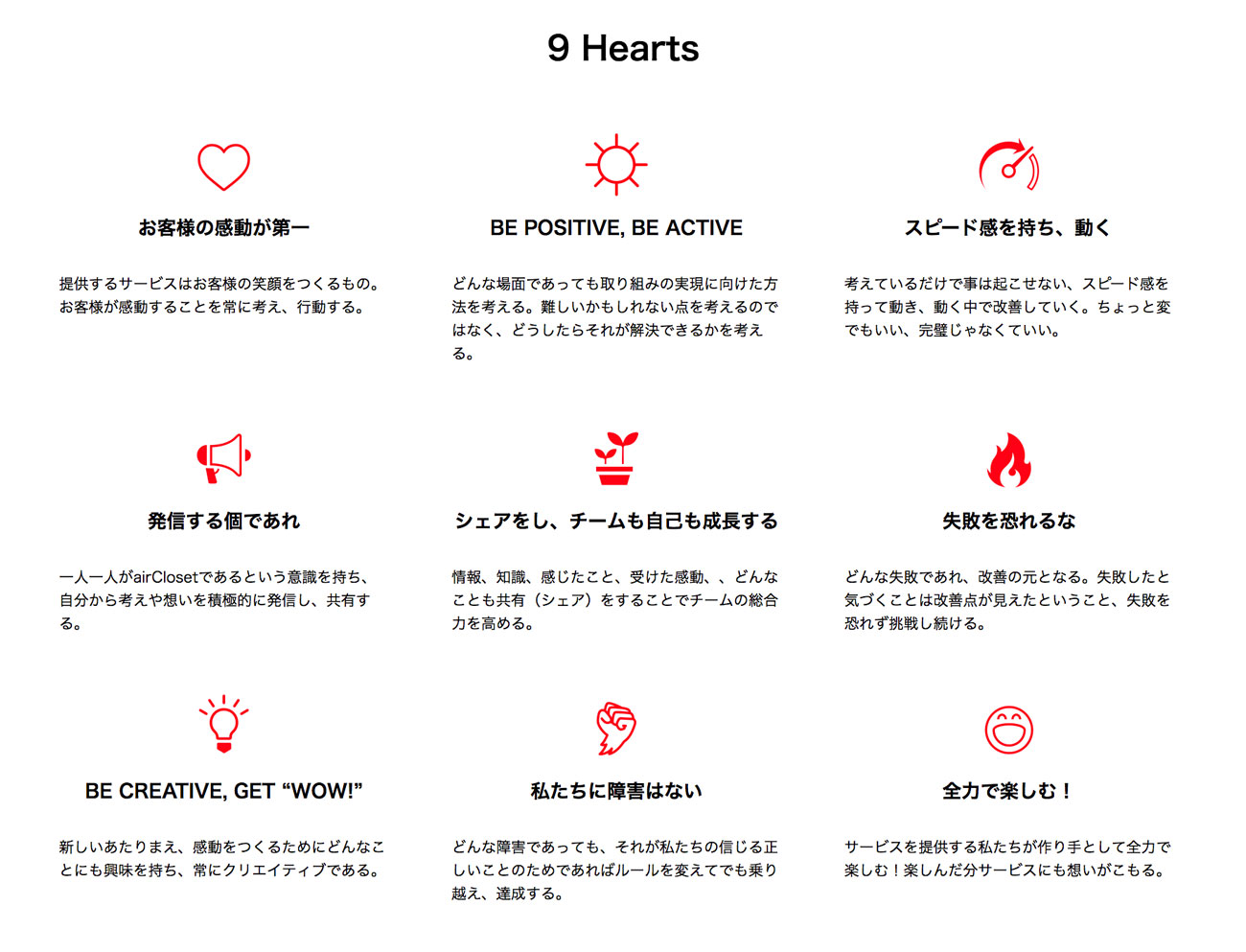 当社では「9 Hearts」と呼んでいる9つの行動指針を掲げています。他に「スピード感を持ち、動く」「失敗を恐れるな」などがありますが、先の「感動」はその筆頭で、お客様がしてほしいことを提供して満足していただくのではなく、想像を超える喜びや楽しみをお届けして感動していただくことを目指そうとしています。それが一番いいサービスですし、それを重ねる先にブランド創造や市場創造があると考えています。