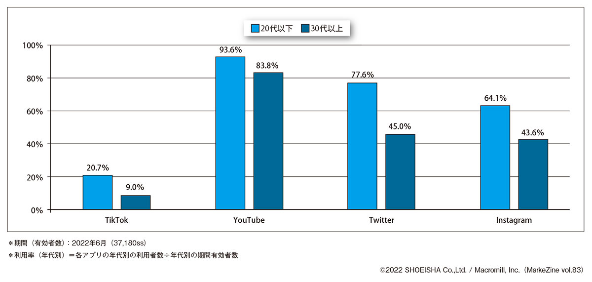 動画・SNSアプリの利用率(図表7)を確認すると、TikTokの利用率は20代以下で20.7%であり、30代以上では9.0%であることが確認できます。
