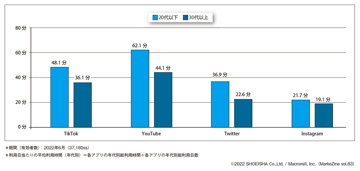 TikTokの利用時間は20代以下で48.1分、30代以上で36.1分であることから、若年ユーザーが活発にTikTokを利用していることが確認できます。また、YouTube、Twitter、Instagramについても、年代間の違いを確認すると、利用率・利用時間共に20代以下のユーザーの値が大きく、他のアプリの利用でも20代以下のユーザーの活動が盛んである傾向が現れています。