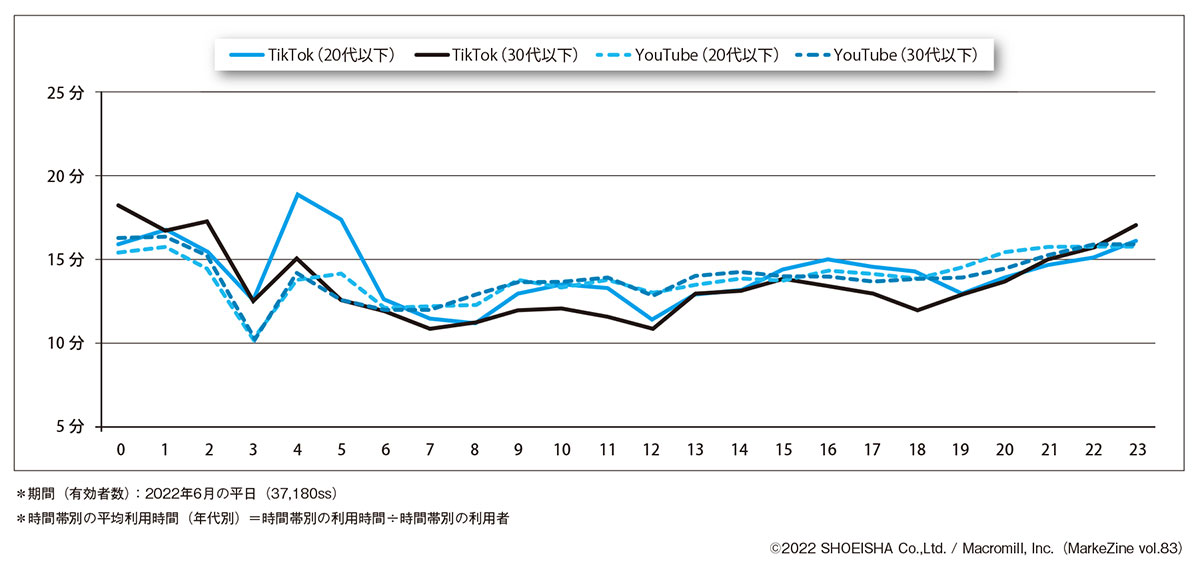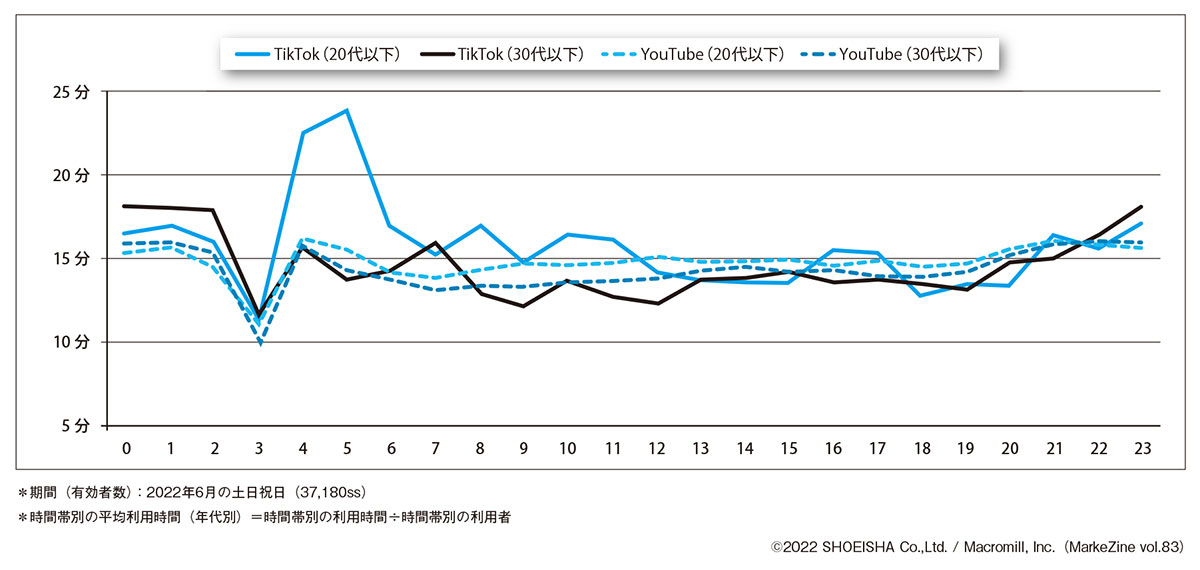 また、平日の利用傾向を確認すると、15〜18時で20代以下のTikTok利用が、YouTubeよりも活発であることから、学生ユーザーが放課後の時間帯で利用していることが推測できます。土日祝日では、20代以下の午前の時間帯の利用時間が長くなる傾向が特徴的なため、暇ができる時間帯での利用が活発となることが考えられます。