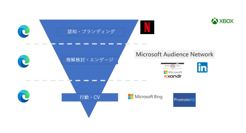 有園:認知からコンバージョンまで、フルファネル型のアプローチを可能にしています。具体的には、ファネルの上部から下部に至るまでのMicrosoft Edgeを軸に、たとえばNetflixはブランディングとして位置づけています。Xboxへの広告配信も、具体的な広告プロダクトとしてはこれからですが、ここに入るでしょう。