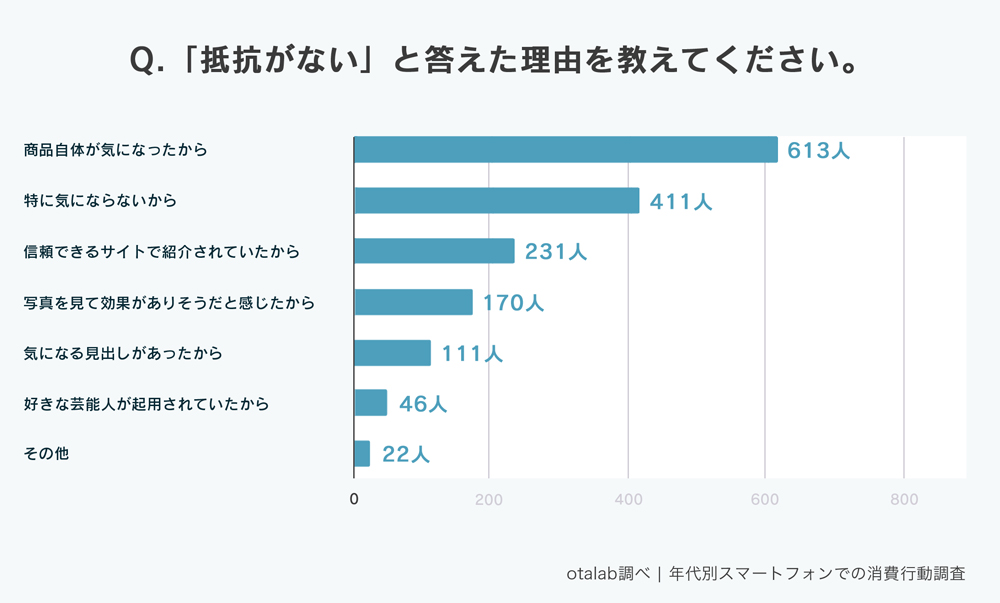 一方、抵抗がないと答えた人の理由を尋ねると、『商品自体が気になったから』が最も多い回答で全体の72%だった。