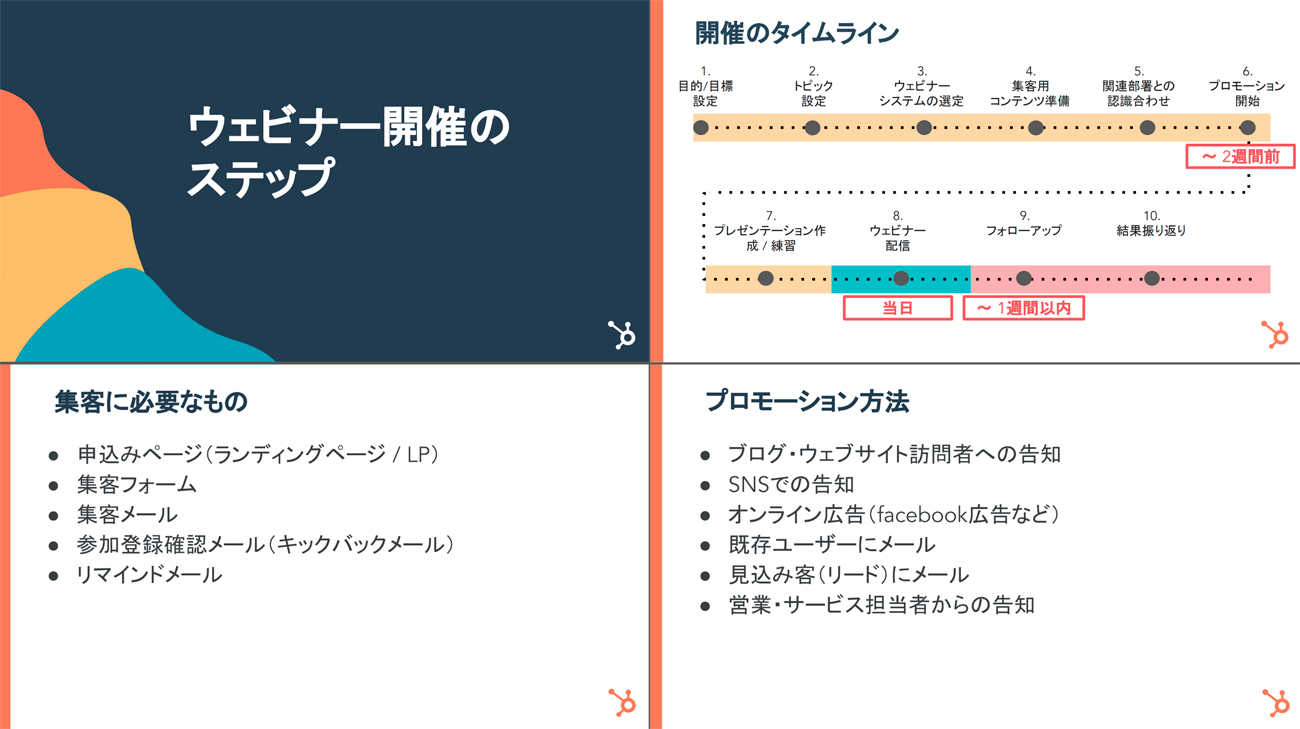 そのため、ウェビナー当日に多くの質問を頂いて時間内に回答できなかった場合は後日メールで回答をお届けしたり、ウェビナー内で使った資料や映像も極力お渡しできるようにしたりといった工夫をしています。たとえば、2020年4月、コロナ禍初期に実施した「効果的なウェビナーを開催するための10のポイント」というウェビナーでは、ウェビナーを初めて開催する方でも視聴後すぐに自社ウェビナーの企画にとりかかれるよう、「集客に必要なもの」などをまとめた資料を送付しました(下記画像)。