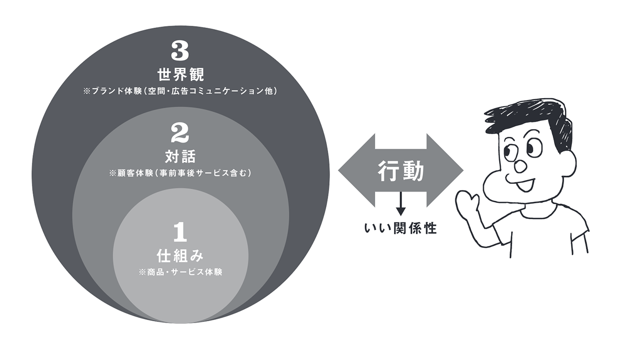 ブランドが提供する体験は、重なる3つの円(レイヤー)で考えると理解しやすくなります。中心の円は、(1)「仕組み(コア)」の体験です。商品やサービスそのものの体験を指します。ここでは、ひらいた表現として、仕組み体験と規定しています。