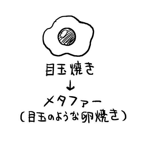 たとえば、目玉焼きはメタファーです。「黄身を目玉に見立て」て言っているメタファー表現です。メロンパンも同様に「パンをメロンに見立て」ているメタファーです。