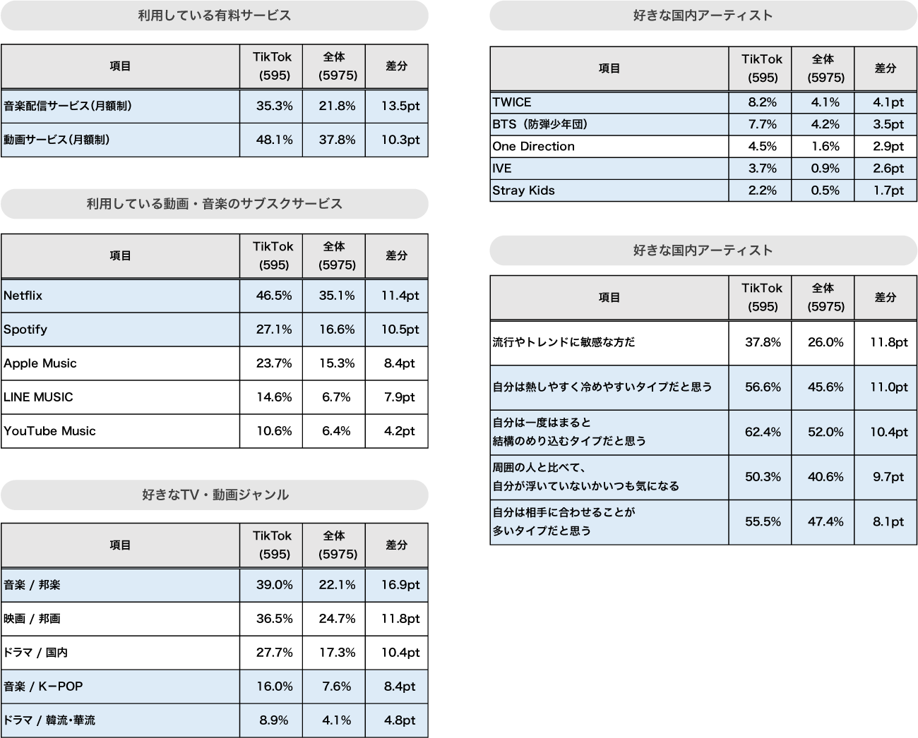 続いて、これらの趣味趣向に関連するパーソナリティ価値観を確認します。TikTokユーザーは「周囲と比べて浮いていないか」「相手に合わせる」など周囲の人間との同調意識が強いため、身近な友人や家族と同じ趣味を共有していることが考えられます。また「一度はまるとのめり込む」価値観が強く、1年間に行う活動の中でも「音楽関連商品の購入」や「音楽イベントへの参加」の割合が高いことから、アイドルのライブ参加やグッズ購入などを積極的に行う「推し活」との親和性が高いことが考えられます。