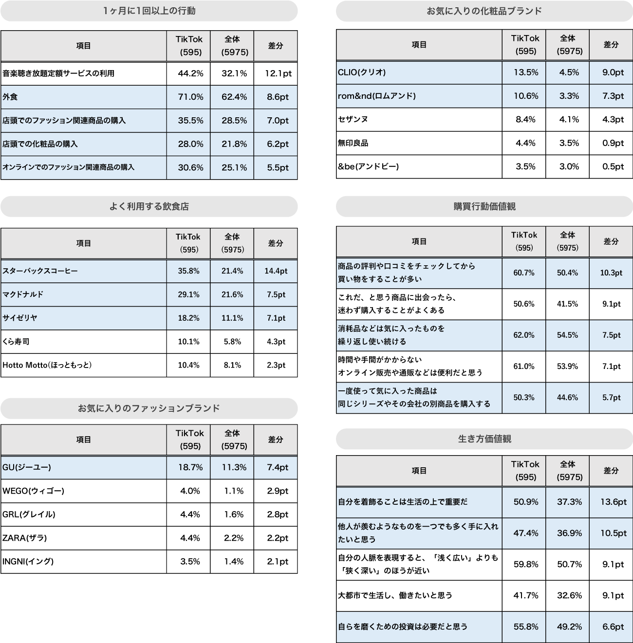 まず、TikTokユーザーの行動習慣を把握するために、1ヵ月に1回以上の行動を確認すると、「外食」「ファッション関連商品の購入」「化粧品の購入」のポイントが高いことから、TikTokユーザーは外食やショッピングなどを行う頻度が高いことが考えられます。