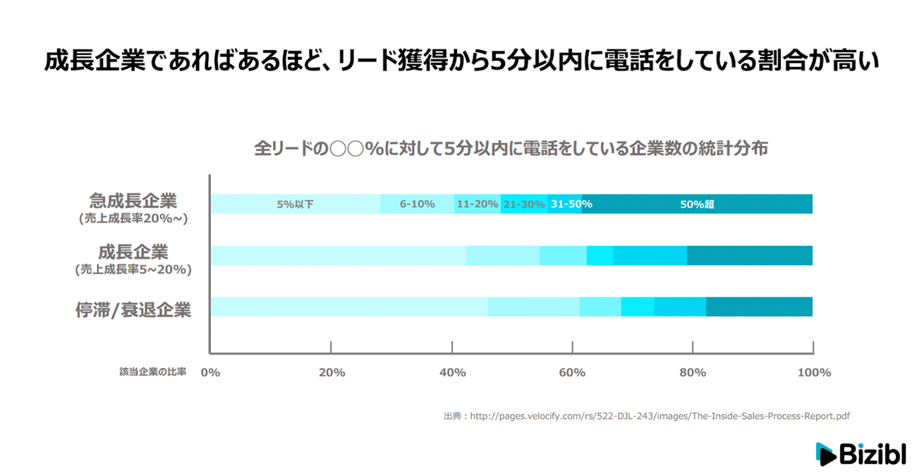 マーケティング界隈では、InsideSales.comの「リード獲得から5分以内に架電すると10分以内に架電した場合の4倍も見込み案件につながりやすい」という調査発表があるように、やはり成長企業ほどスピーディなフォローアップを行っています。