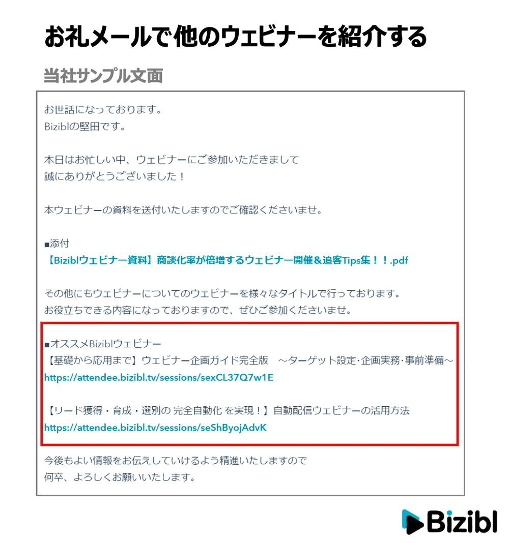 実際に私がウェビナー後に送っているお礼メールでは、このように他のウェビナーをご案内しています。