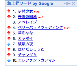流行ワードの確認方法は多々あるが、一例としてはgooランキングのキーワードランキングがRSSフィードに対応していて便利だ。また、人気急上昇のワードを追うのであればGoogle 急上昇ワードもお薦めである。これはiGoogle用ガジェットだが、XML形式でデータを取得することも可能だ。