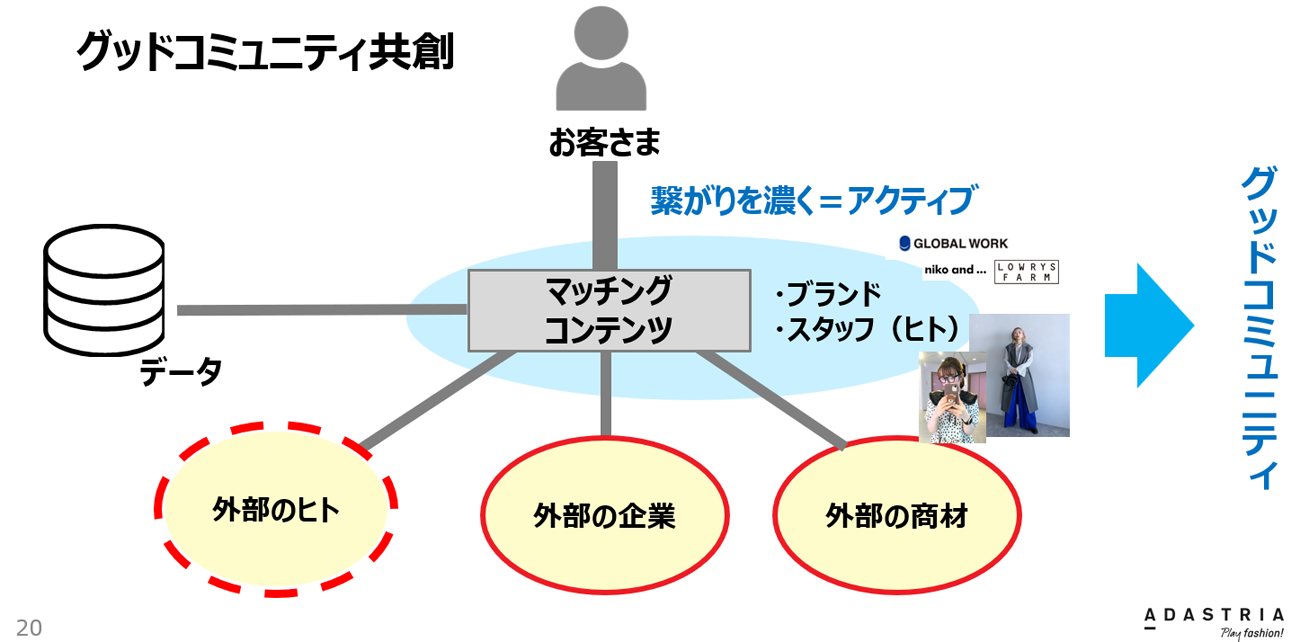3つ目の「外部を巻き込むサービス」とは一言でいうと、自社ECプラットフォームのオープン化である。ある程度会員数を抱えた自社ECサイトは、今後様々な可能性が出てくると田中氏は推測。アダストリアは今、会社全体で「グッドコミュニティ共創」というテーマを掲げているという。