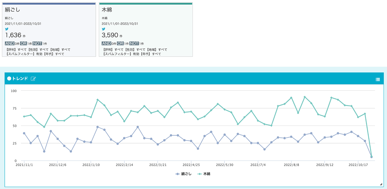 分析の期間を設定し、比較できます。自社製品に対するUGC量の前年比や、広告展開前と後の効果検証などに活用できます。