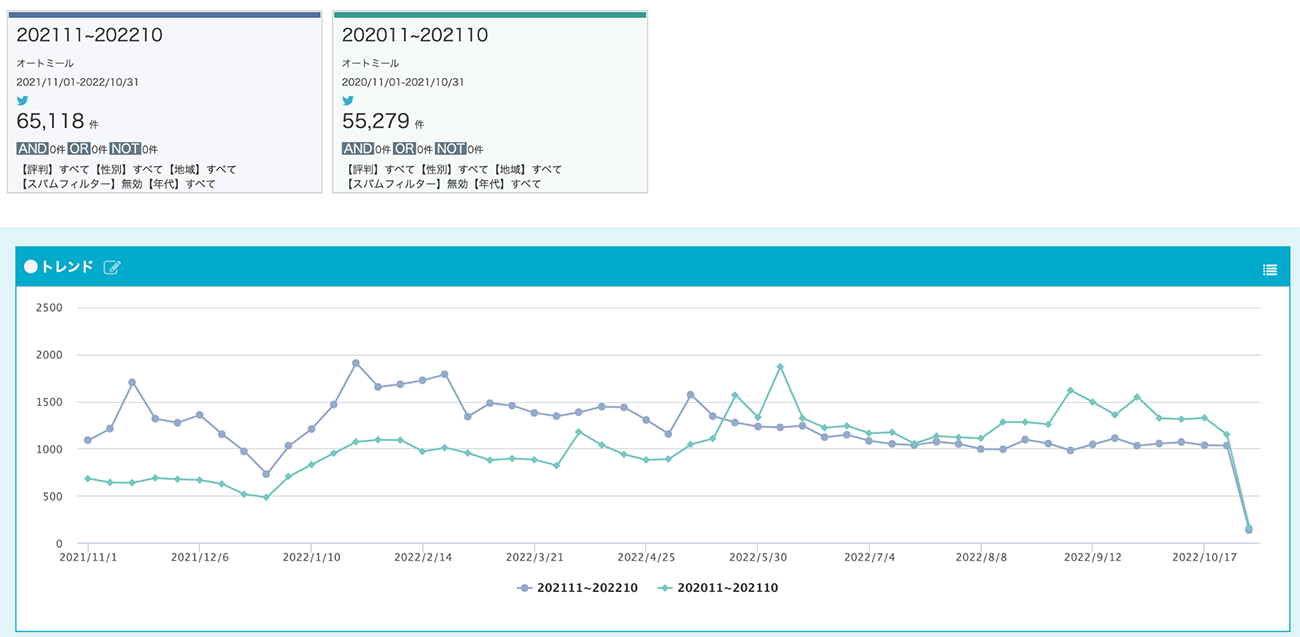 期間A(2021年11月〜2022年10月)と期間B(2020年11月〜2021年10月)における「オートミール」を含むツイート数の比較