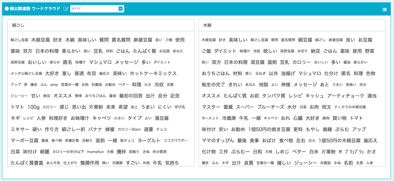 「絹ごし」「木綿」のそれぞれと一緒にツイートされるキーワードをテキストマイニングでリスト化したもの。左上が最も頻出するキーワード。右下に向かうに従って少なくなる