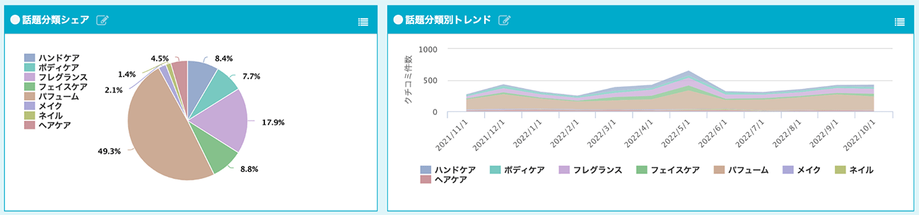 ここまで紹介してきた多様な分析手法を組み合わせることで、より高度にUGC分析を行うことができます。たとえば、「期間による比較」と「分類」を組み合わせた分析がこちらです。