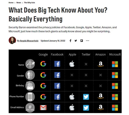 では、大手プラットフォーマーの状況はどうなのか? 次のPCMagの記事「What Does Big Tech Know About You? Basically Everything | PCMag」をぜひ参照して欲しい。この記事では、それぞれ、Google、Facebook、Apple、Twitter、Amazon、Microsoftが、収集していることを認めているデータ項目を列記し、比較表示している。