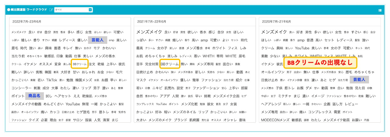 過去3年間の頻出関連語から、「BBクリーム」という商材のUGCが増加していることに注目しました。
