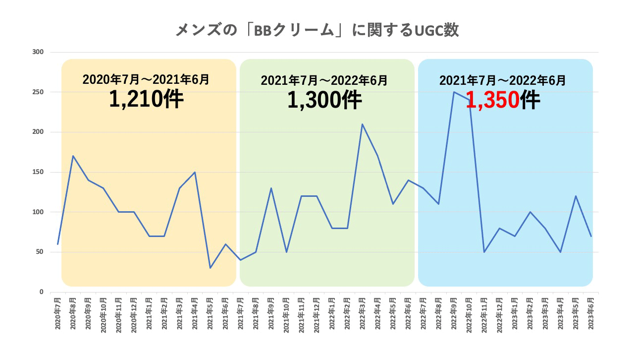 また、実際のUGCの中身を見ていくと、男性のユーザーからBBクリームを使った感想や悩みに関する言及が、過去3年間で徐々に増えていることがわかりました。