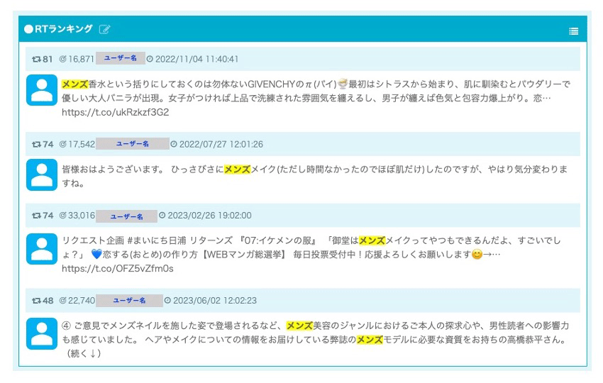 今回は、「共感されるUGCを発信している=影響力がある」と仮定し、リツイートされた回数の多いUGCを見ていくことで、メンズコスメと関わりの深いインフルエンサーを探しました。
