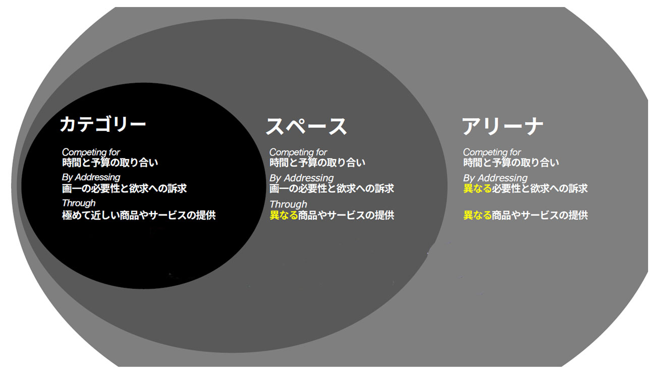 同じ商品・サービス間で競争する「カテゴリ」の区分ではなく、ある特定のニーズに対して異なる商品やサービスをもって応えようとする区分が「アリーナ」で、前者は欲求を具現化したところで戦っており、後者は欲求の段階で戦っているという違いがあります。これによってブランドのマインドシェアが変わってくるので、アリーナでの戦い方が今後は非常に重要になってきます。