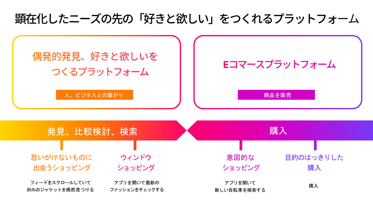 他にはないInstagramの特徴は2つあります。1つは「発見型コマース」と呼ばれる新しい購買体験です。従来のオンラインの購買体験はECサイトで検索するステップがあるため、消費者が頭の中に思い浮かぶ商品しか買えませんでした。Instagramが提供する発見型コマースであれば、アルゴリズムによって利用者が好みそうなものが表示されるので、本来買い物リストになかった商品に出会う機会が生まれるのです。言うなれば「商品が顧客を見つける」仕組みです。これはMetaが持つビッグデータによって実現できるものです。