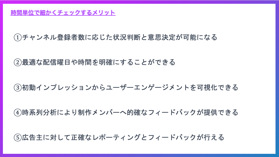 当社では特別な分析ツールを活用していません。YouTube アナリティクス1本で分析してきました。既にYouTube アナリティクスを活用されている方も多いと思いますが、重要なのはアナリティクスの数字を分解して、いかに時間単位でデータを見るかです。インプレッション数やクリック率、総再生回数などを「1日平均」ではなく「1時間」「2時間」「3時間」単位で細かく見る癖をぜひ身に付けてください。