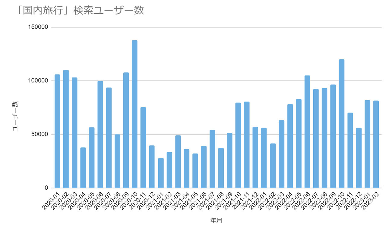 次に、こちらは2020年1月から2023年2月までの「国内旅行」検索ユーザー数の推移です。