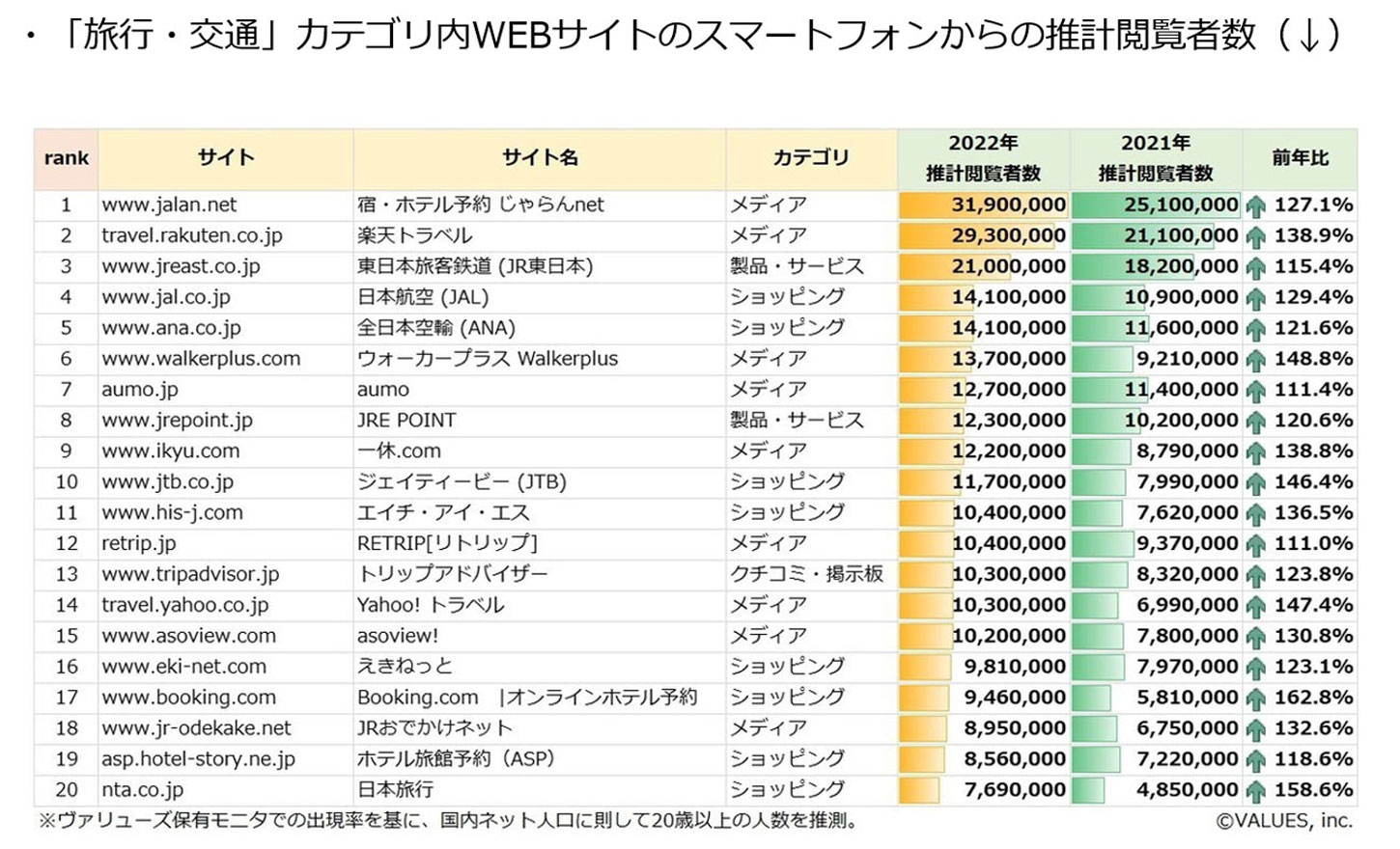 加えて、公益社団法人日本観光振興協会とヴァリューズとの協同調査「2022年観光関連サイト推計閲覧者数ランキング」の結果も確認してみました。