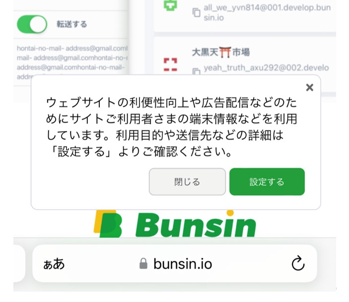 さらに、上記の内容を「通知」または「容易に知り得る状態に置く」とされていますが、「通知」とはポップアップでの表示のことです。Webサイトやアプリの利用者に対し、以下の画像のようなポップアップを表示し、記載事項を確認できるページに遷移させる方法が考えられます。「容易に知り得る状態に置く」については、Webサイトのフッターに「Cookieポリシー」や「情報の外部送信について」などのリンクを設置し、上記の記載事項を確認できるページに遷移させる方法が、アプリについては起動時に表示される最初の画面から遷移させる方法が考えられます。