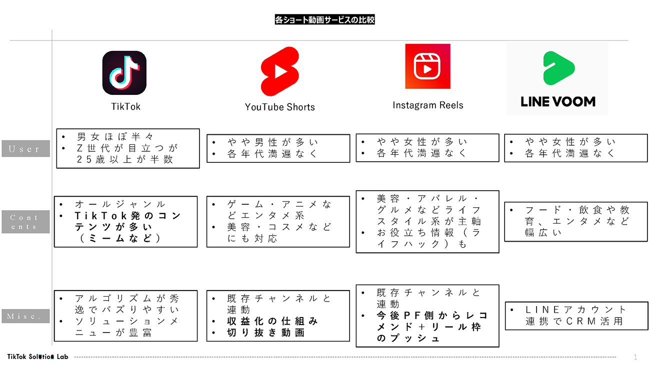 ショート動画に特化したTikTokを除き、YouTube ShortsとInstagram Reels、LINE VOOMのMAUを厳密に測ることは難しいが、天野氏によると「YouTubeとInstagram、LINE自体のMAUのうち6割前後がショート動画を使っているのではないか」とのことだ。各プラットフォームの特徴を天野氏は次のように説明する。
