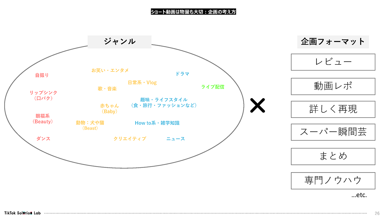 ここから天野氏は、ショート動画の制作ポイントを解説する。ショート動画プラットフォームでは日々大量のコンテンツが発信されているため、“珠玉の1本”を生み出すことよりも物量作戦が効果的だという。ショート動画と相性の良いジャンルと企画フォーマットを掛け合わせて量算する体制を天野氏は推奨する。