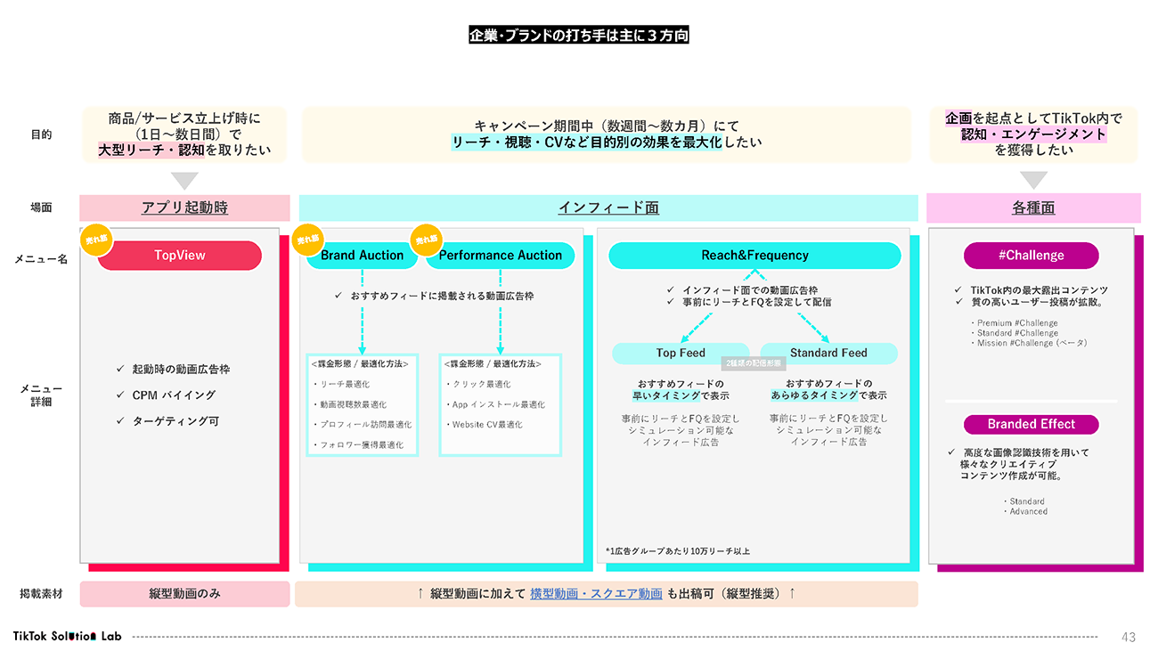 TikTok内で認知やエンゲージメントを高めたい場合は、ハッシュタグチャレンジやブランドエフェクトが効果的だという。後者はブランドの世界観を高度な画像認識技術を用いて表現するTikTokの広告メニューだ。キャンペーン期間中にリーチ・視聴・CVを最大化したい場合はインフィード広告が、新商品をリリースしたタイミングで大型のリーチ・認知を獲得したい場合はアプリ起動時に配信される動画広告メニュー「TopView」を天野氏は勧める。