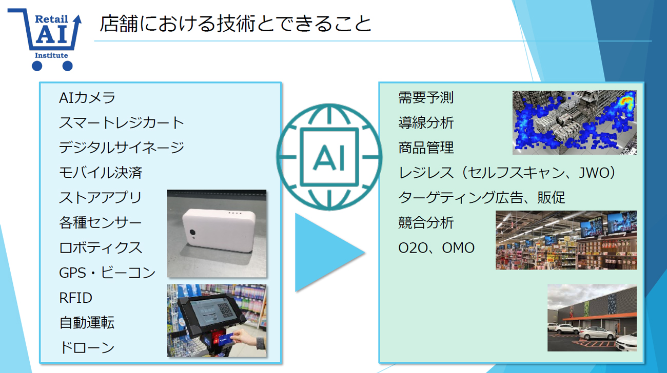 「AIカメラやスマートレジ、サイネージ、ロボットの他、最近ではドローンや自動運転を使った配送の実証実験が行われています。それもAIを活用し、需要層や動線分析を行いながら進めています」(田中氏)