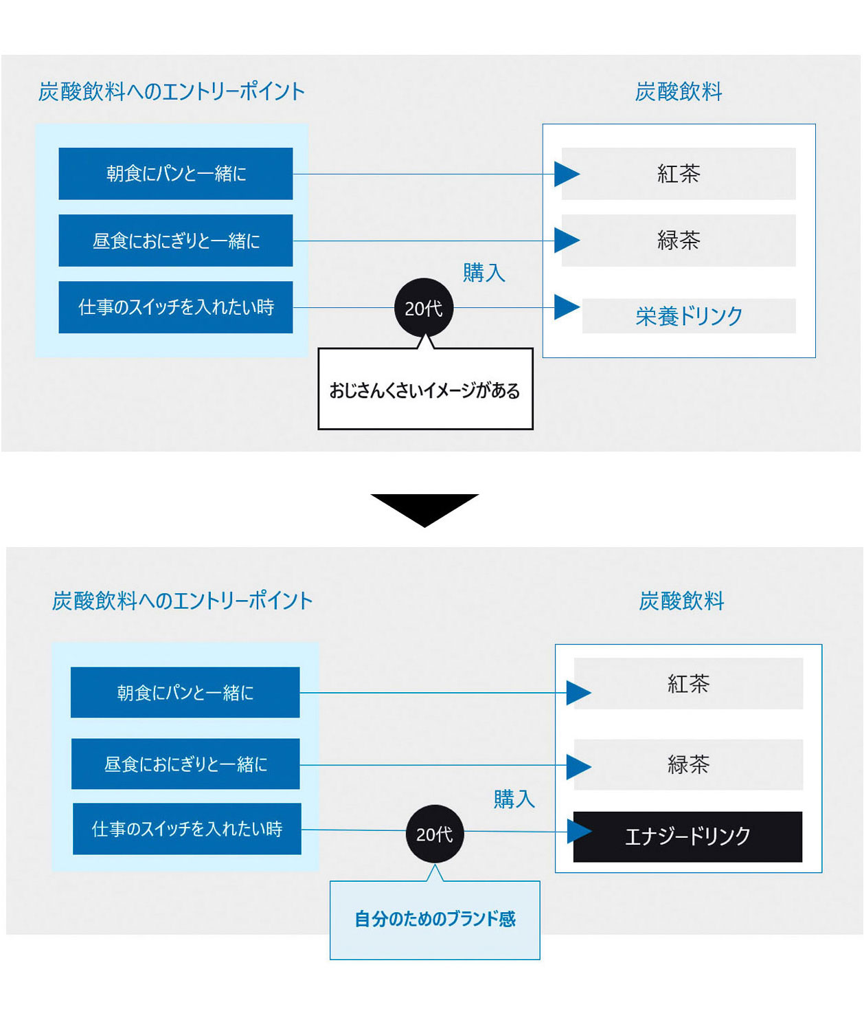 たとえば、「仕事のスイッチを入れたい時」というCEPでは、長らく「栄養ドリンク」がリンクしていました。ですが、主に20代の若年層においては、なんとなく「栄養ドリンク=おじさんくさい」というイメージがあり、まさにすわりが悪いCEPになっていたのではないかと思います。エナジードリンクは、このすわりの悪さを捉え、うまくリンクをスイッチさせることに成功しました。