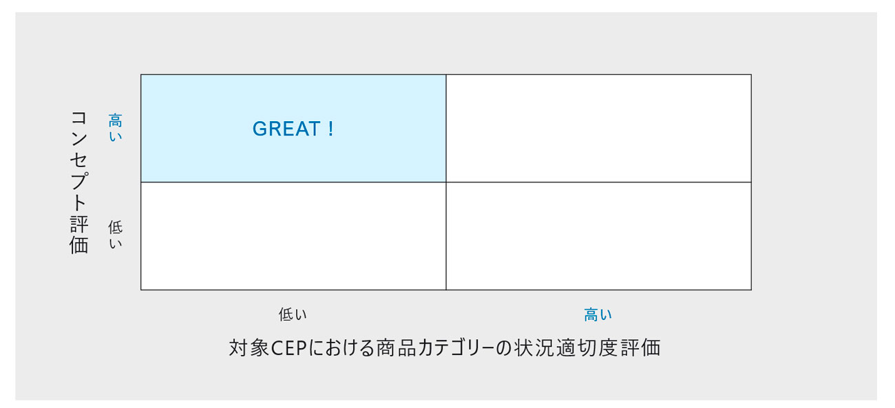 具体的には、コンセプト評価の前段で、対象のCEPにおける商品カテゴリーの「状況適切度」を聞いた上で、コンセプトの評価を回答者に行ってもらいます。その結果、「当初の状況適切度は低かったが、コンセプトを見た結果、そのCEPにおけるブランド評価が高くなる」コンセプトをよしとします。「当初はそのCEPでその商品カテゴリーを使用・飲食することは適さないと考えていたけれども、コンセプトを見た結果、そのCEPでそのブランドを購入・飲食したい」と思われることができれば、現在は他のカテゴリーやブランドにリンクしているCEPに、自社商品のリンクを付け直すことができるポテンシャルが高いと判断できるということです。