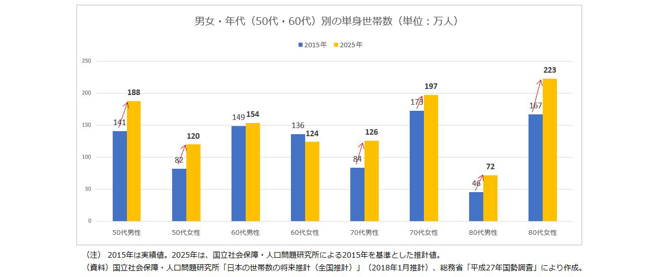 国立社会保障・人口問題研究所が公表した直近の将来推計によれば、2025年の単身世帯(一人暮らし)は、2015年より8.4%増えて1996万世帯になると見られている(2015年基準推計)。ここで着目したいのは70歳以上の増加と「これからシニア」である50代の増加である。