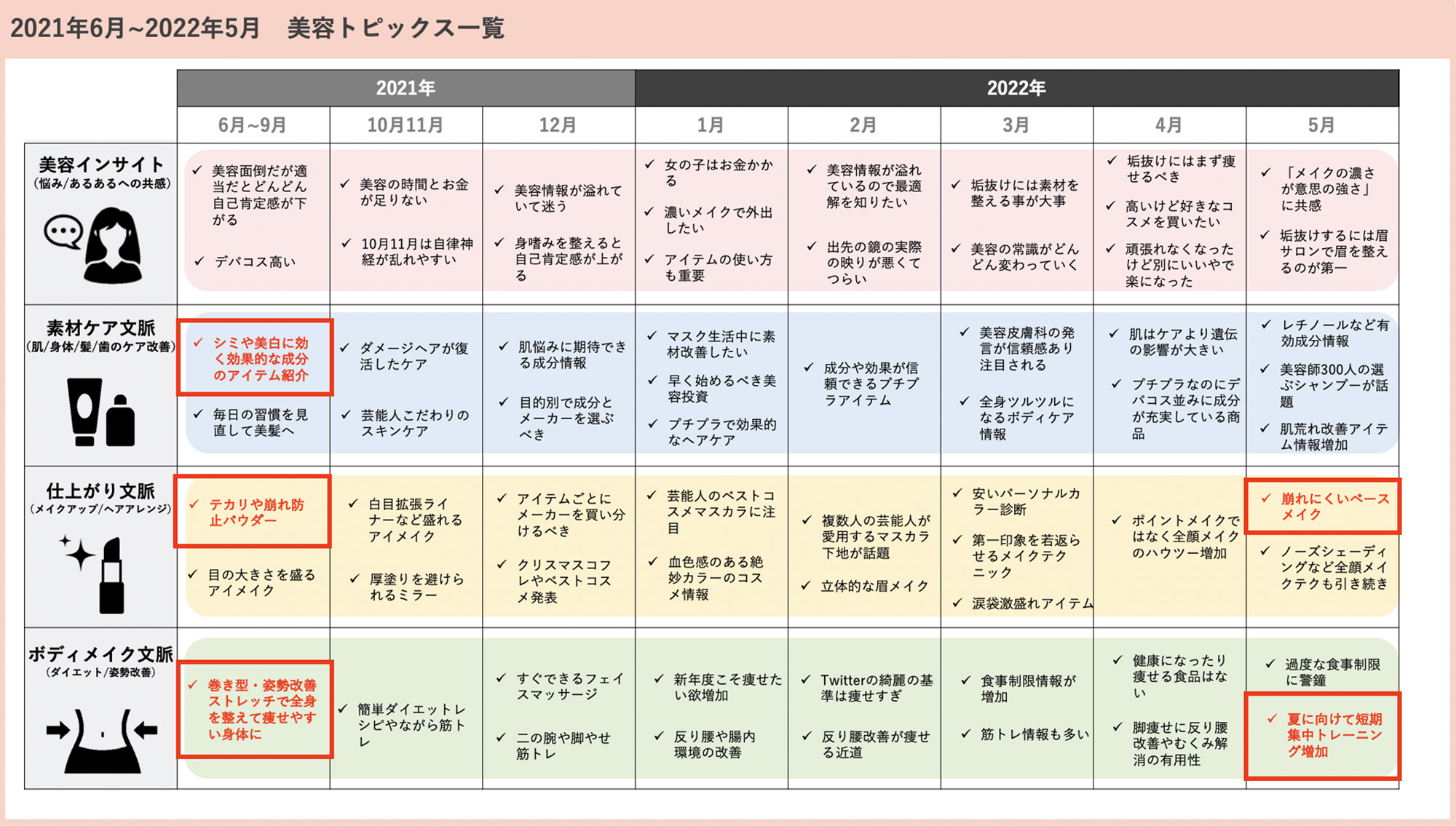 以下は2021年6月から2022年5月のSNS上の美容トピックスをTwitterでの投稿傾向からまとめた表です。
